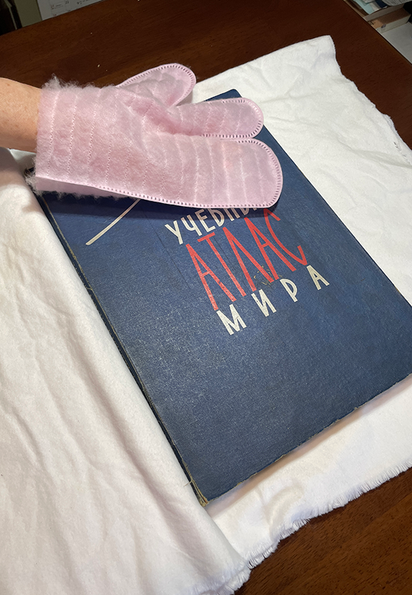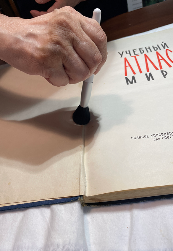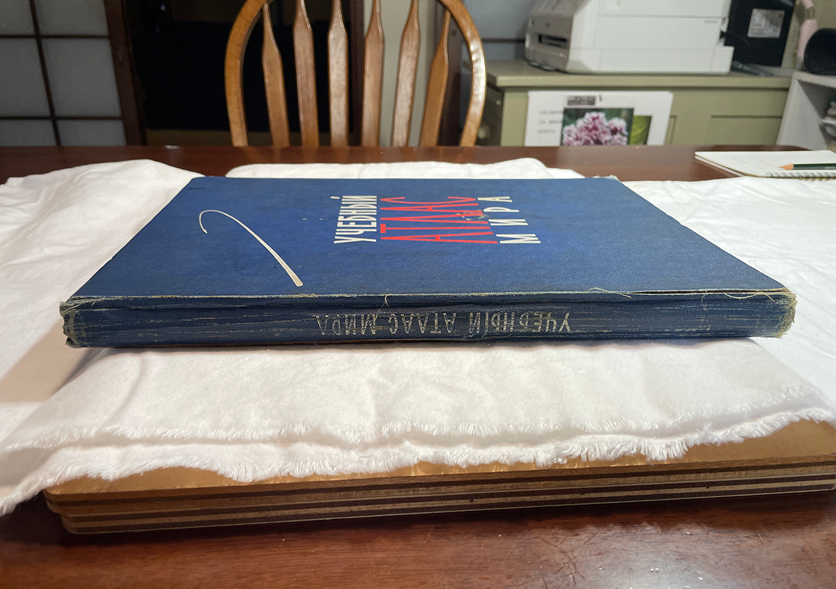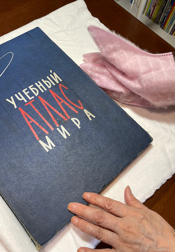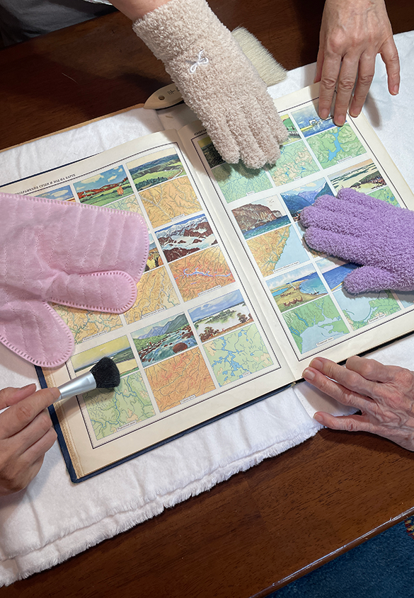 カルテの改訂の確認後は、お預かりしていた地図帳を久しぶりに確認します。傷や汚れが付かないように、白のネルの生地を敷いた状態で行いました。