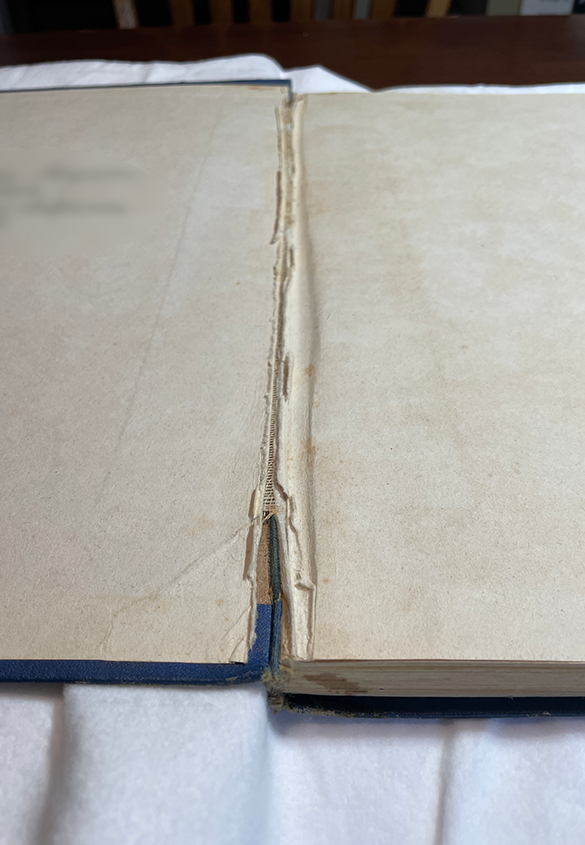 破れによる紙の立ち上がりなどがある見返しののどは注意深く、化粧パウダー用のブラシでなでるように埃を払う。