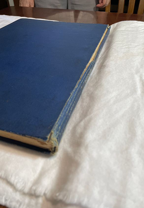クリーニングを終えて本を閉じると、裏表紙に向かって背が若干斜めにずれていることに気が付きました。のどにゆるみがあるので、のどまでしっかり開いてクリーニング作業を行ったことで、背の裏表紙よりの部分に負担がかかったようです。気を付けて下に板を挟んで高さの調整をしていたにも関わらず、です。年月を経た本は繊細ですね。人間の身体と同じかもしれません。この先の作業を進める過程で戻すことができるので、この段階では手で押さえて、表紙側に向かってやさしく押した状態にして、白い紙と板で挟んで重しを乗せて保管します。