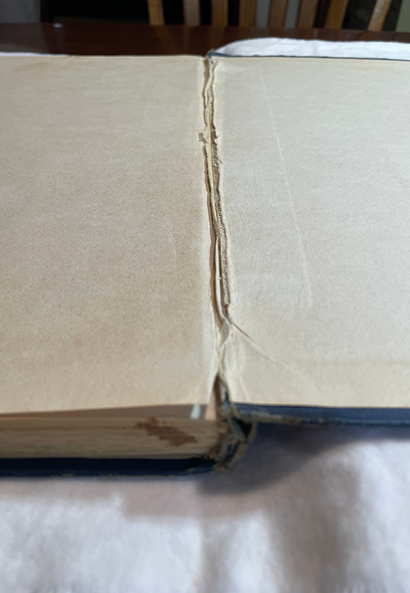 古い本ののどには、なぜか黒っぽい粉や粒が挟まっていることがよくあるという話になりました。クロスが劣化して剥がれた破片ではないか、という私たちの見解です。今回の地図帳は該当しませんが、ステープルで綴じられた本の場合であれば、錆びて腐食した金属製のステープルの破片であることもあるので、シミにならないようしっかりと除去しないとなりません。