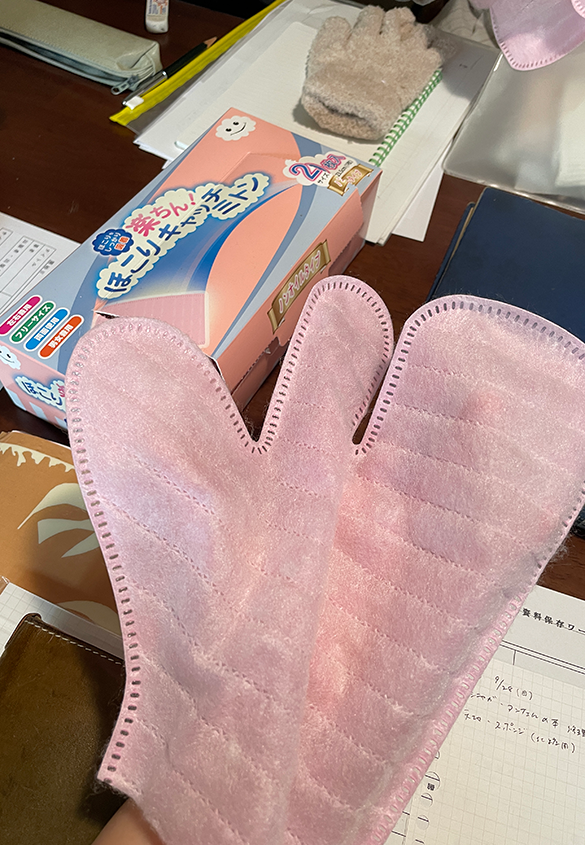ミトンのような形だが、指は3本に分かれていて、天地や小口もふき取りやすい。ただし、続けて拭いていると、不織布の毛羽が絡まって毛玉のようになったものが、逆に埃を生み出し、それが本につくことが判明。クリーニングの始めに、目立った埃やチリをふき取るのには向いているように感じた。