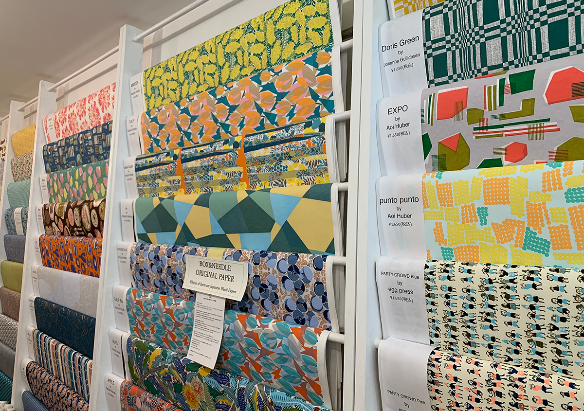 「BOX&NEEDLEでは、紙自体の質感が貼り箱作品の魅力を左右する重要な要素だと考えているんです。セレクトペーパーは柄が引き立つことはもちろんですが、手触りや強度、透け感も考慮して買い付けています。オリジナルペーパーは、昔から使われてきた和紙が中心です。美しいうえに強度があり細工もしやすいため、貼り箱に最適な紙なんですよ。京都の伝統的な和紙と世界中のクリエイターの持つ独特な色彩や模様の要素を融合させることで、手に取ったときにわくわくしたり、発見があるような特別な紙づくりを目指しています」