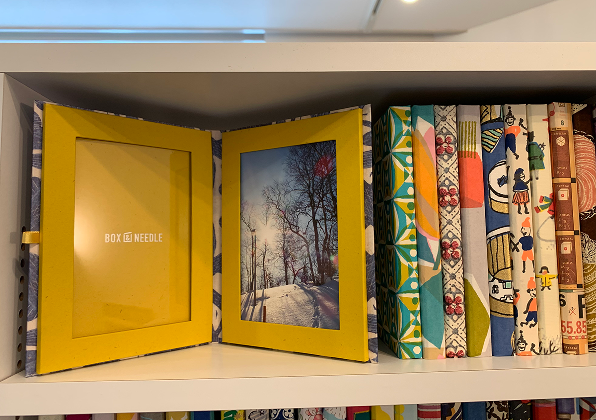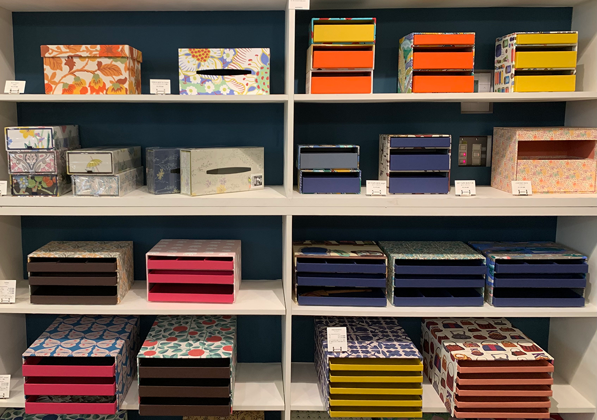 しかも見逃せないのは、それぞれの仕立ての確かさだ。どんな複雑な製品もすみずみまで美しく端正に仕上げられており、頑丈な形状になるようにさまざまな工夫が施されている。「この製品は強度を持たせるために見えない部分を二重にしてあります」「この製品は一度も床に置かず手に持ったまま仕立てるんですよ」と、それぞれの説明を聞くたびに技術の高さに感心してしまう。単に模様が可愛いだけではなく、箱としても上質で実用的な本格派ばかり。それもそのはず、BOX&NEEDLEは、大正時代から続く京都の貼り箱メーカー・マルシゲ紙器が母体なのだ。